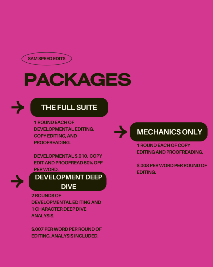 If you’re an author looking for an editor, I’d love to chat to see if we may be a fit! I also am happy to complete a sample edit of up to 5,000 words upon request. I’m here for you however you’d like, and I cant wait to read your words!